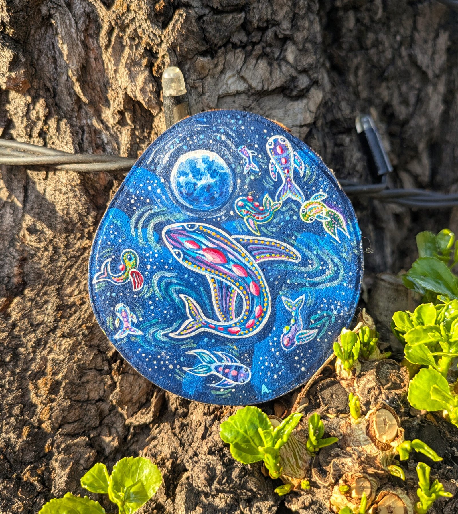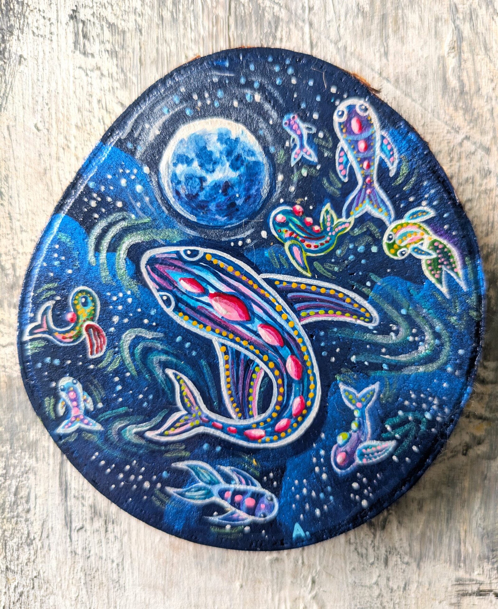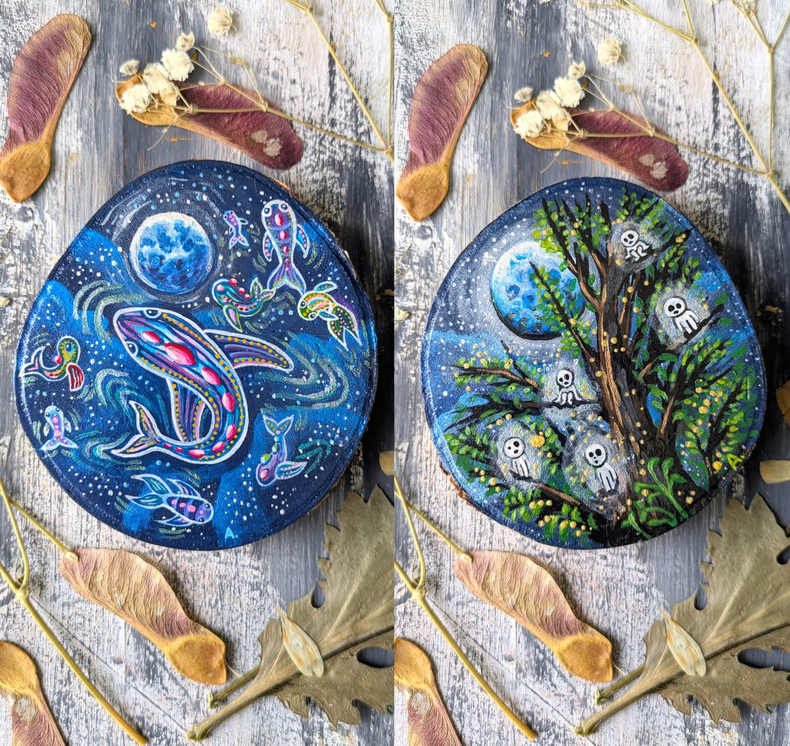 The painting is done on a wooden slice with acrylic and a protective layer on top, painted on both sides, for anyone who enjoys a combined vision of cosmos and ocean , as well as someone who prefers the visual of forest creatures in a woodland environment.