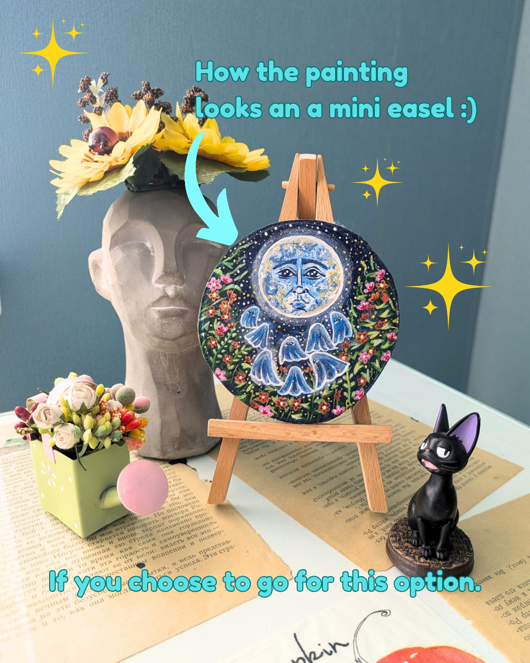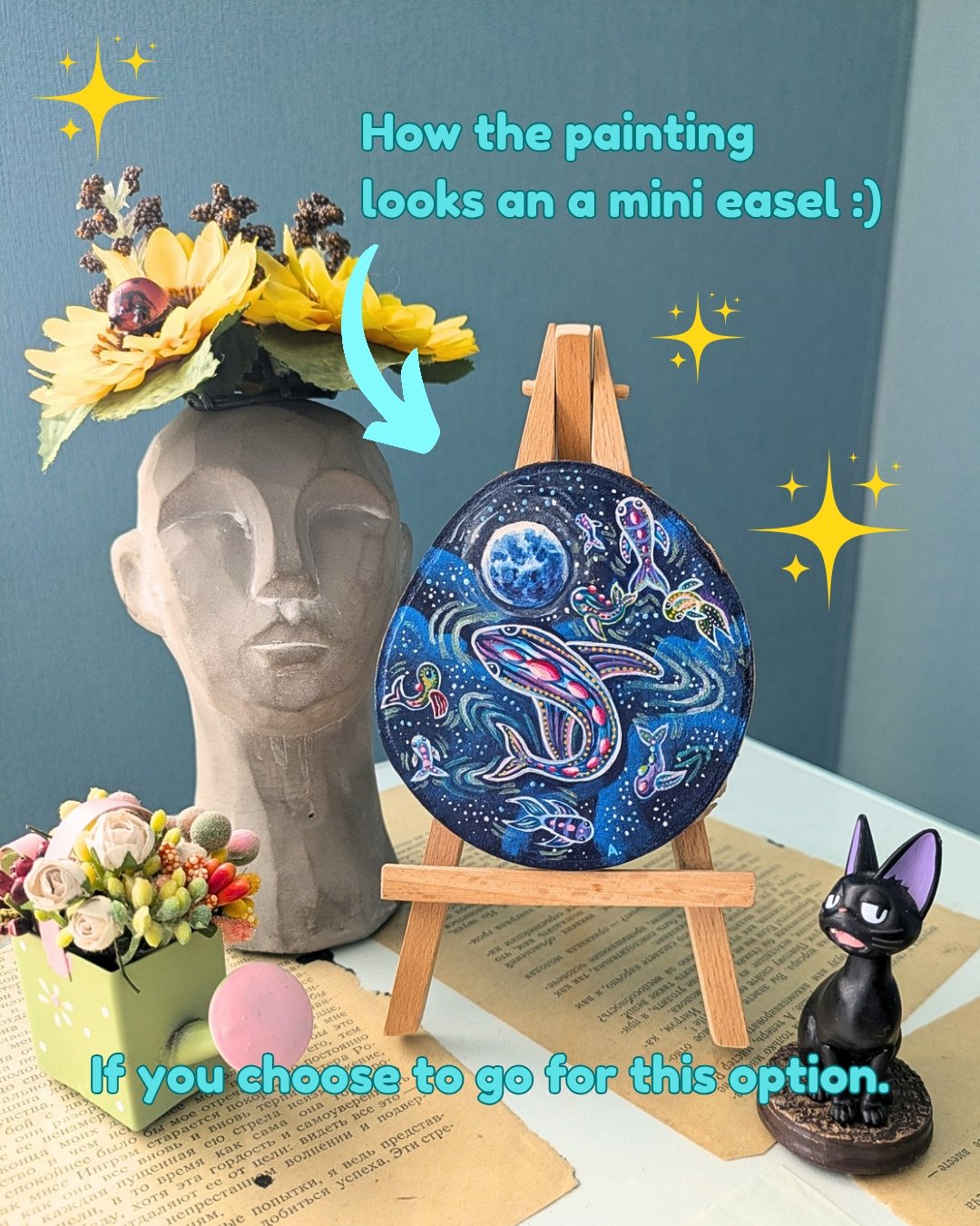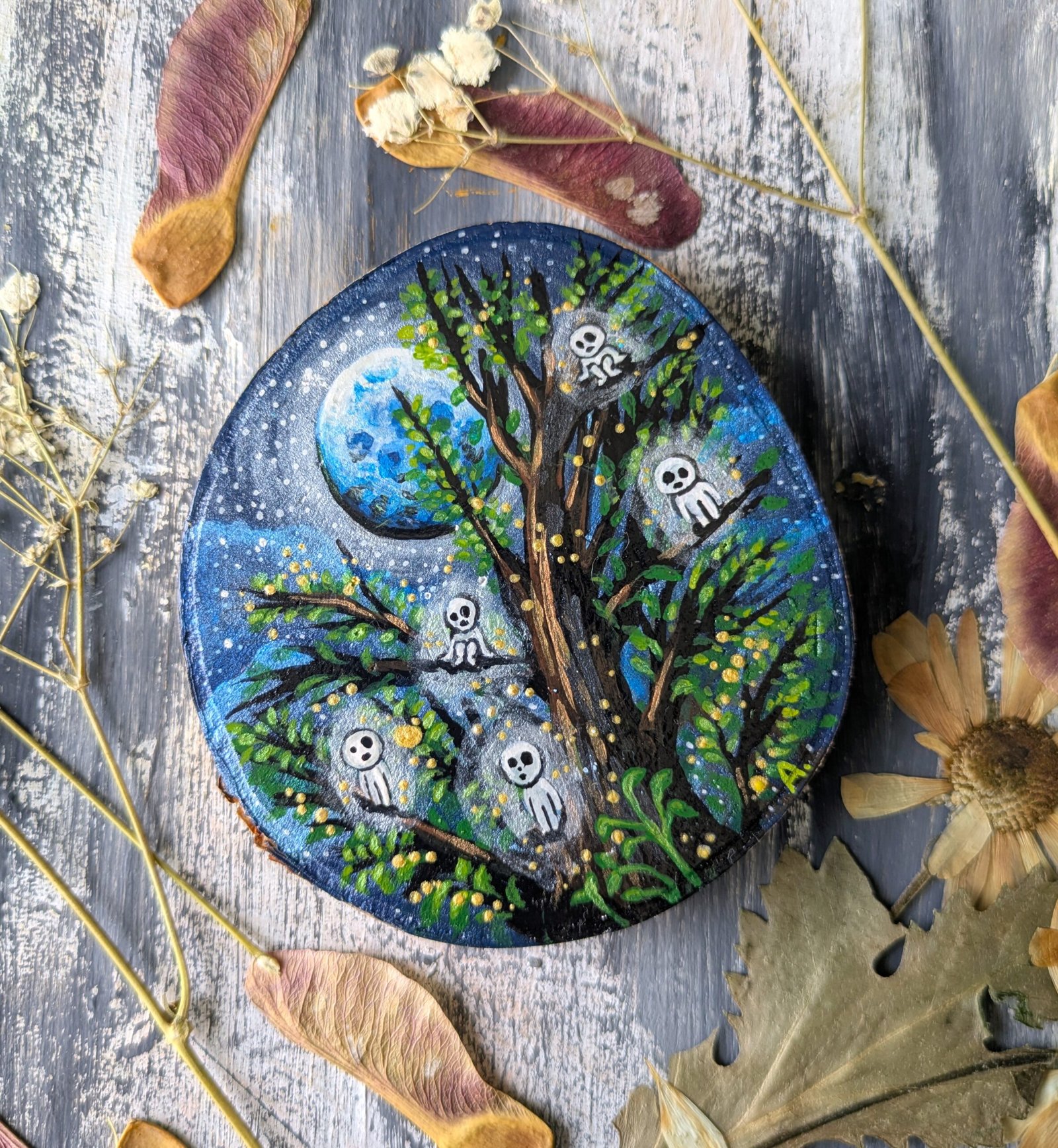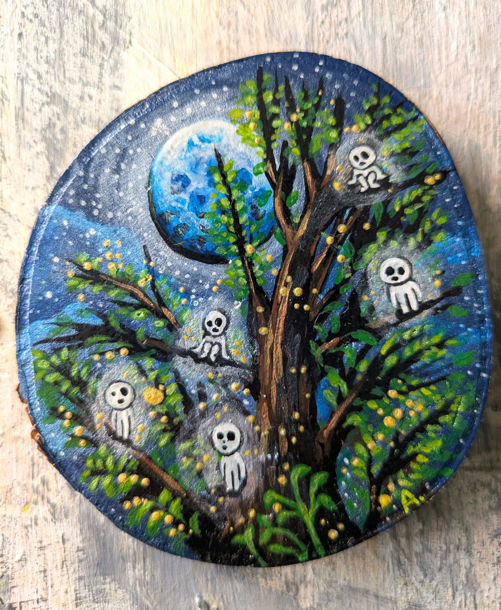 The painting is done on a wooden slice with acrylic and a protective layer on top, painted on both sides, for anyone who enjoys a combined vision of cosmos and ocean , as well as someone who prefers the visual of forest creatures in a woodland environment.