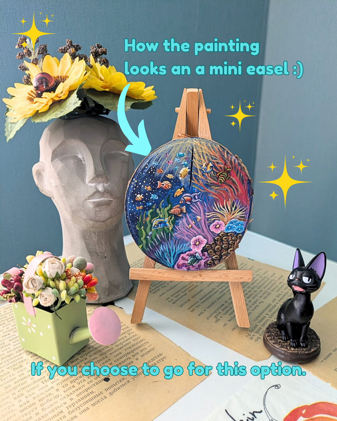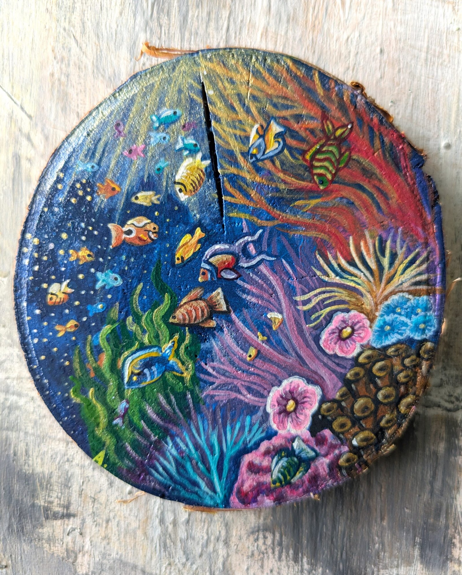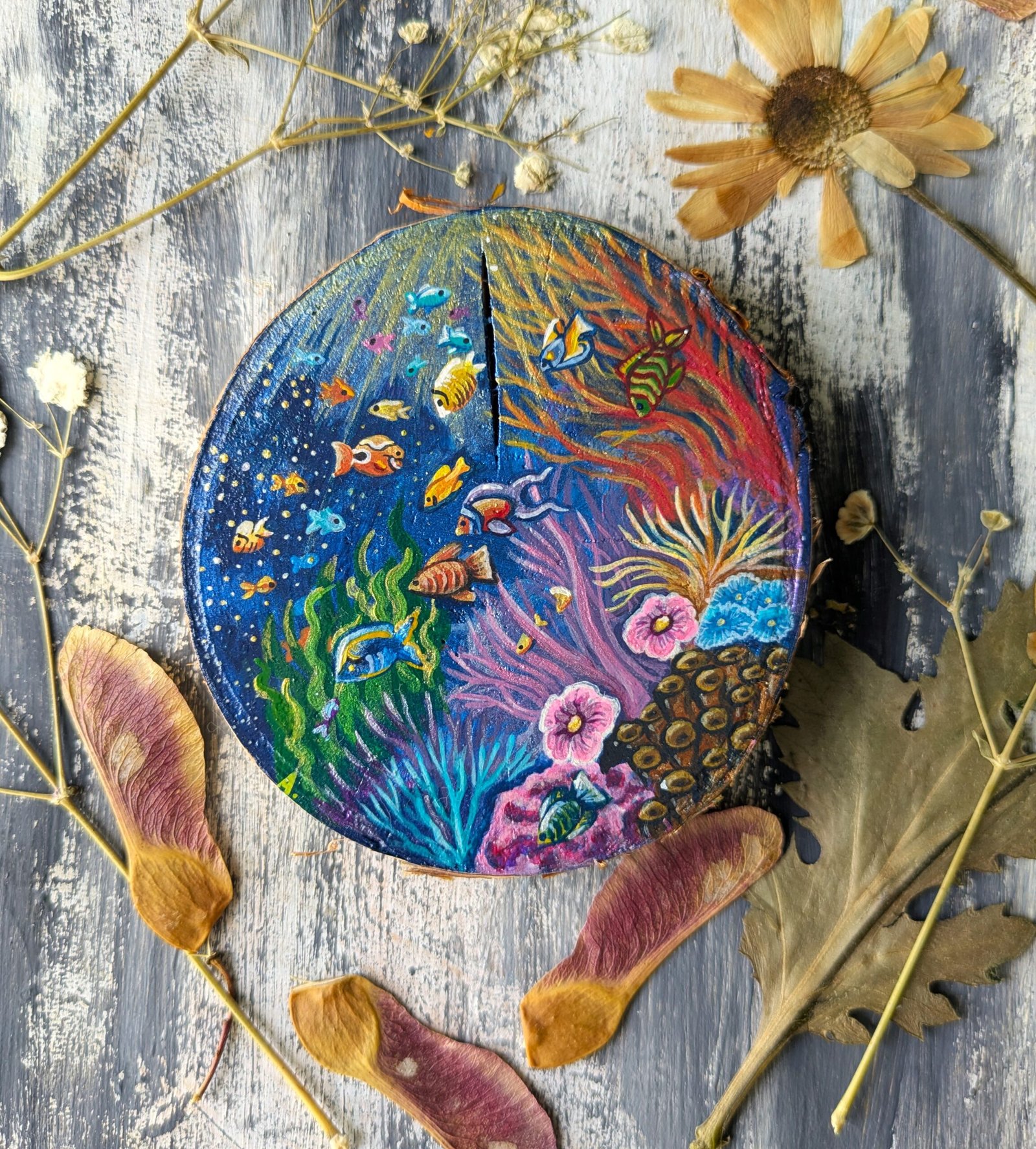 A small window into the ocean depths’, depicting the fauna and flora one might see, when traveling so deep. The painting is done on a wooden slice with acrylics and a protective layer on top.