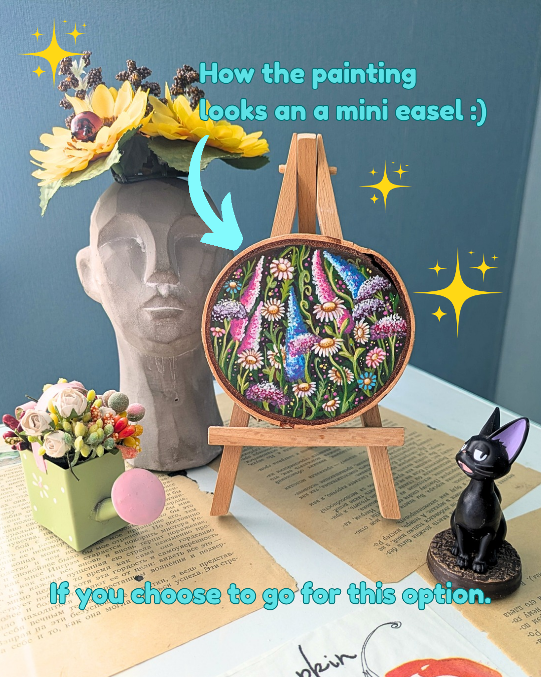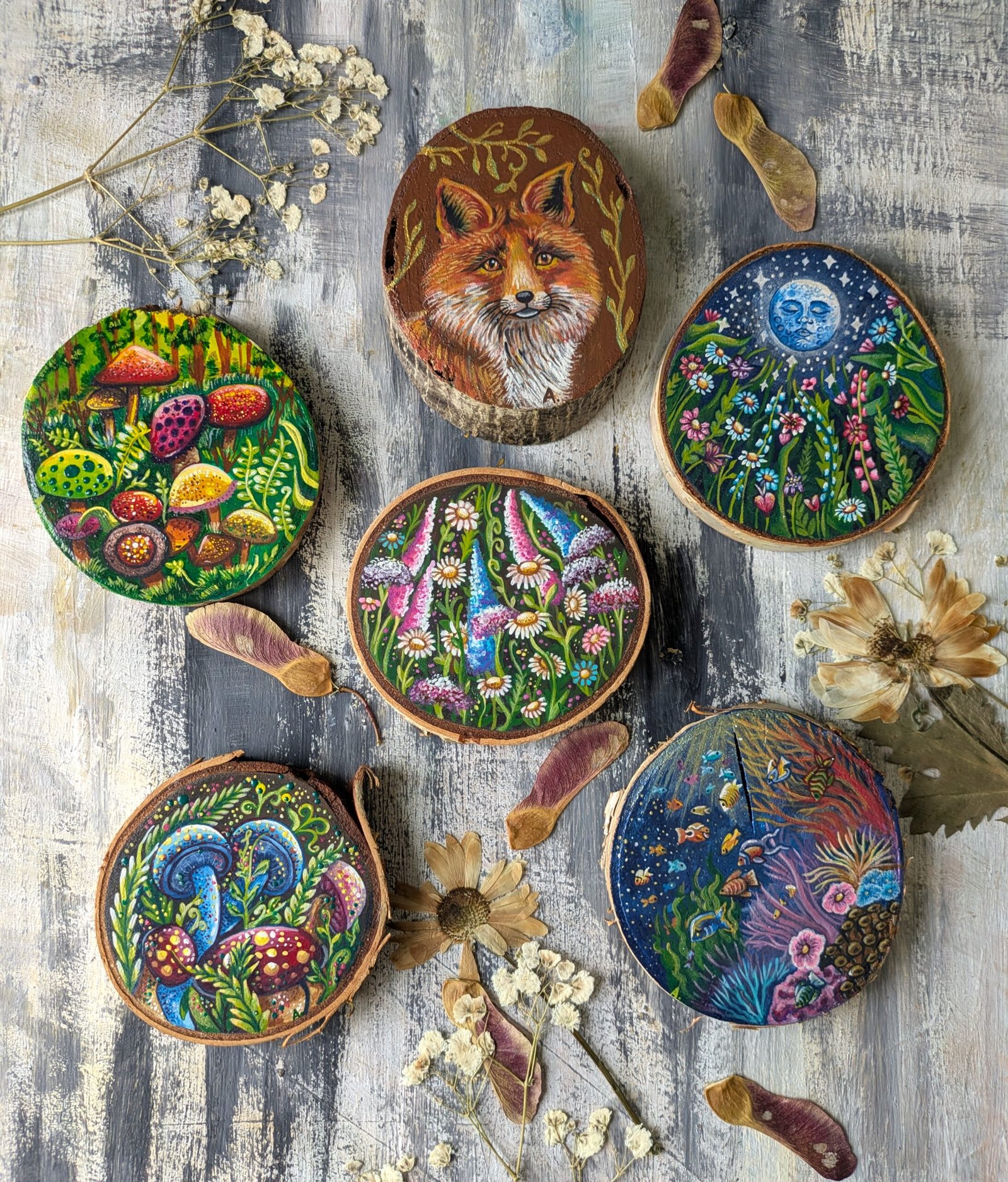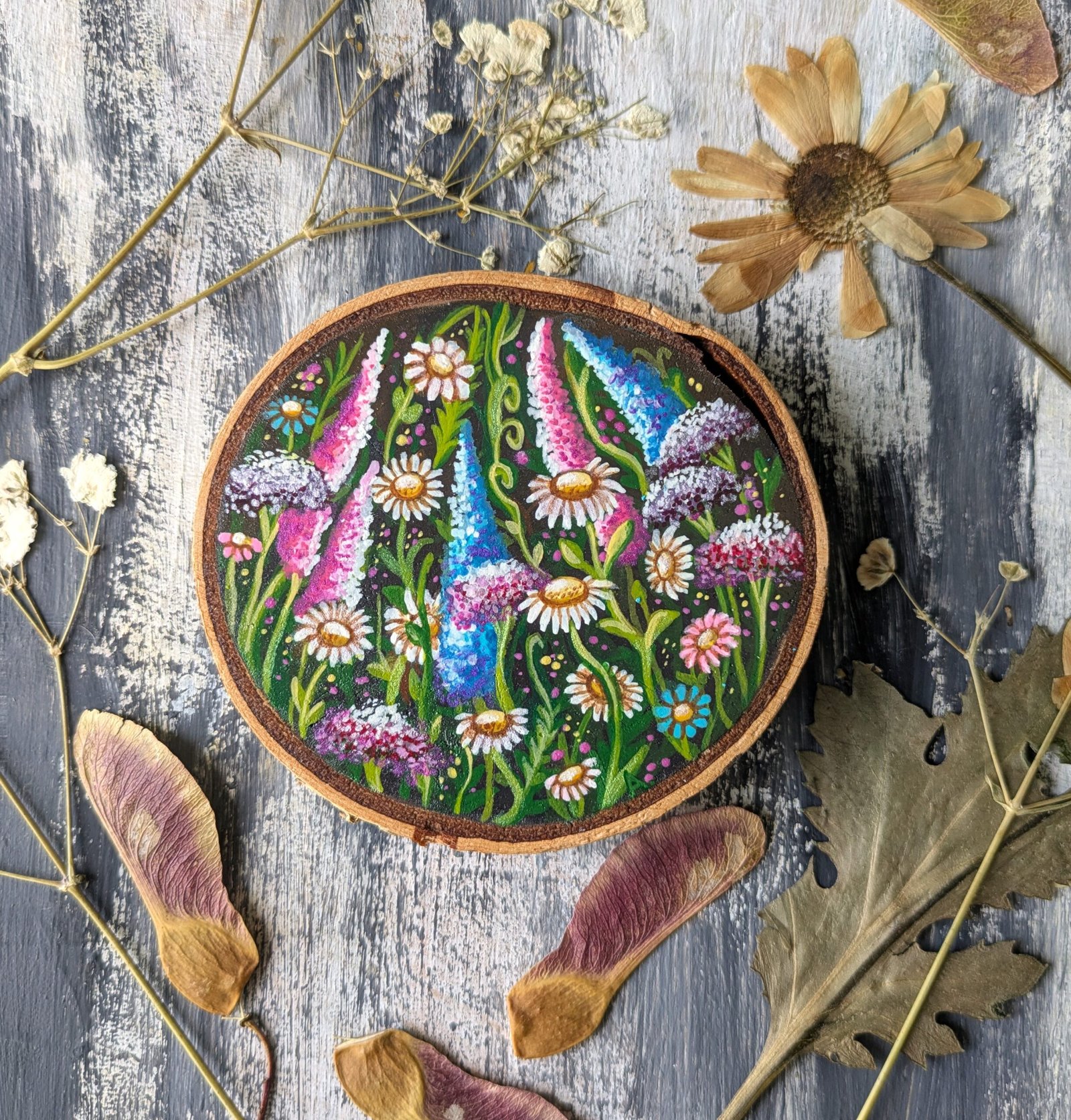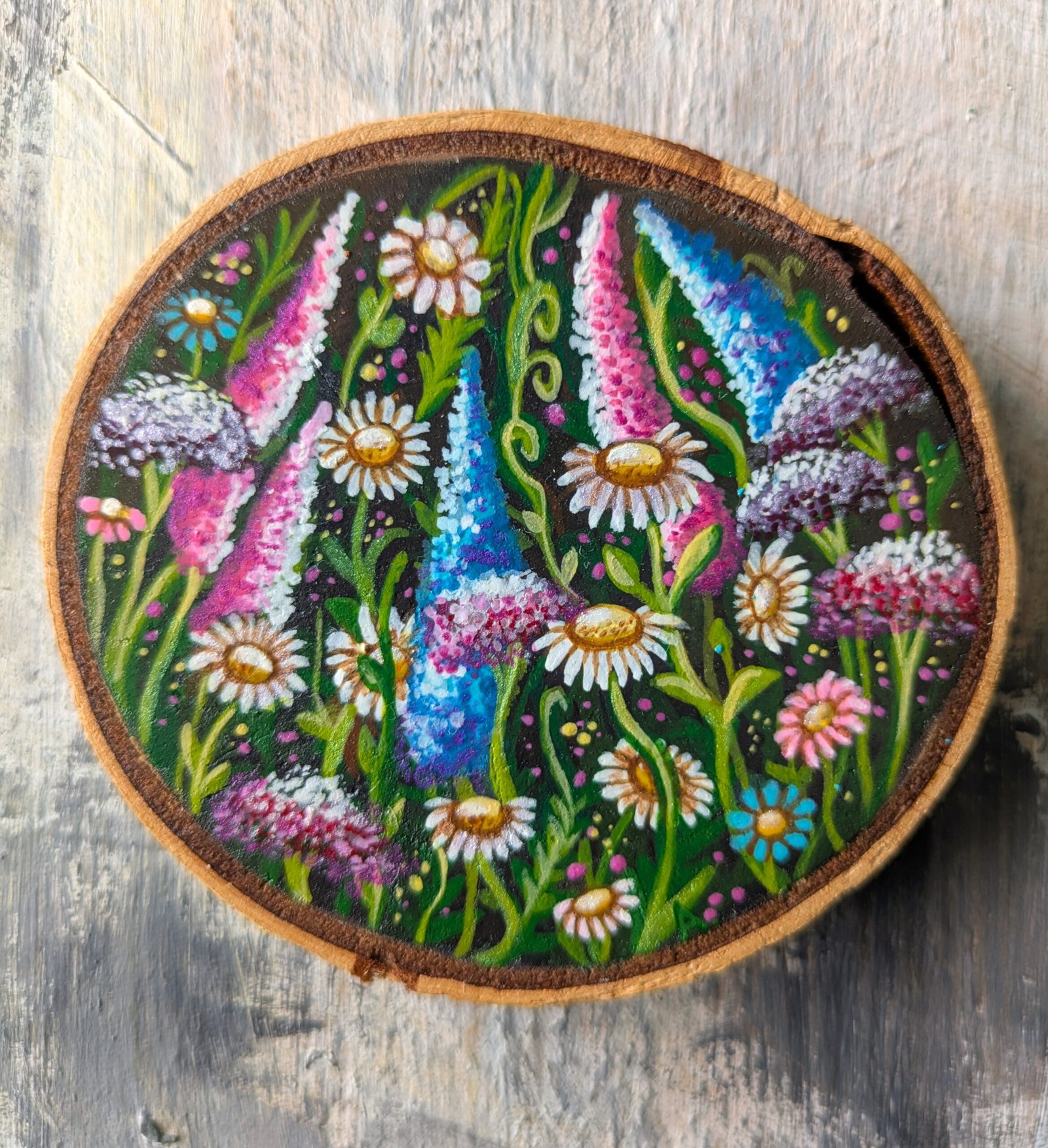A sunny summer field with flowers growing from every direction is a perfect remedy for cold, gloomy days. The paintings is done on a wooden slice with acrylics and a protective layer on top.