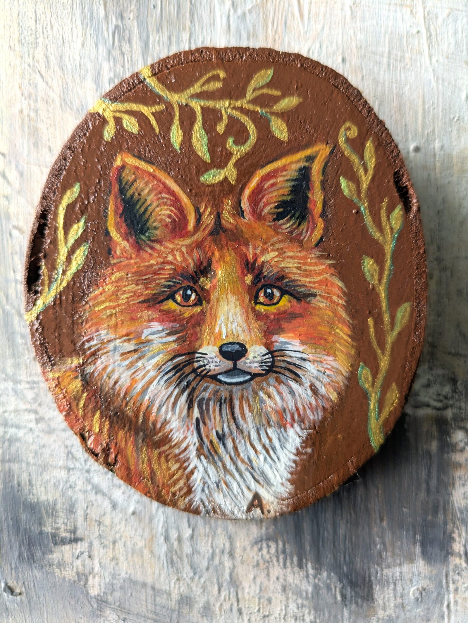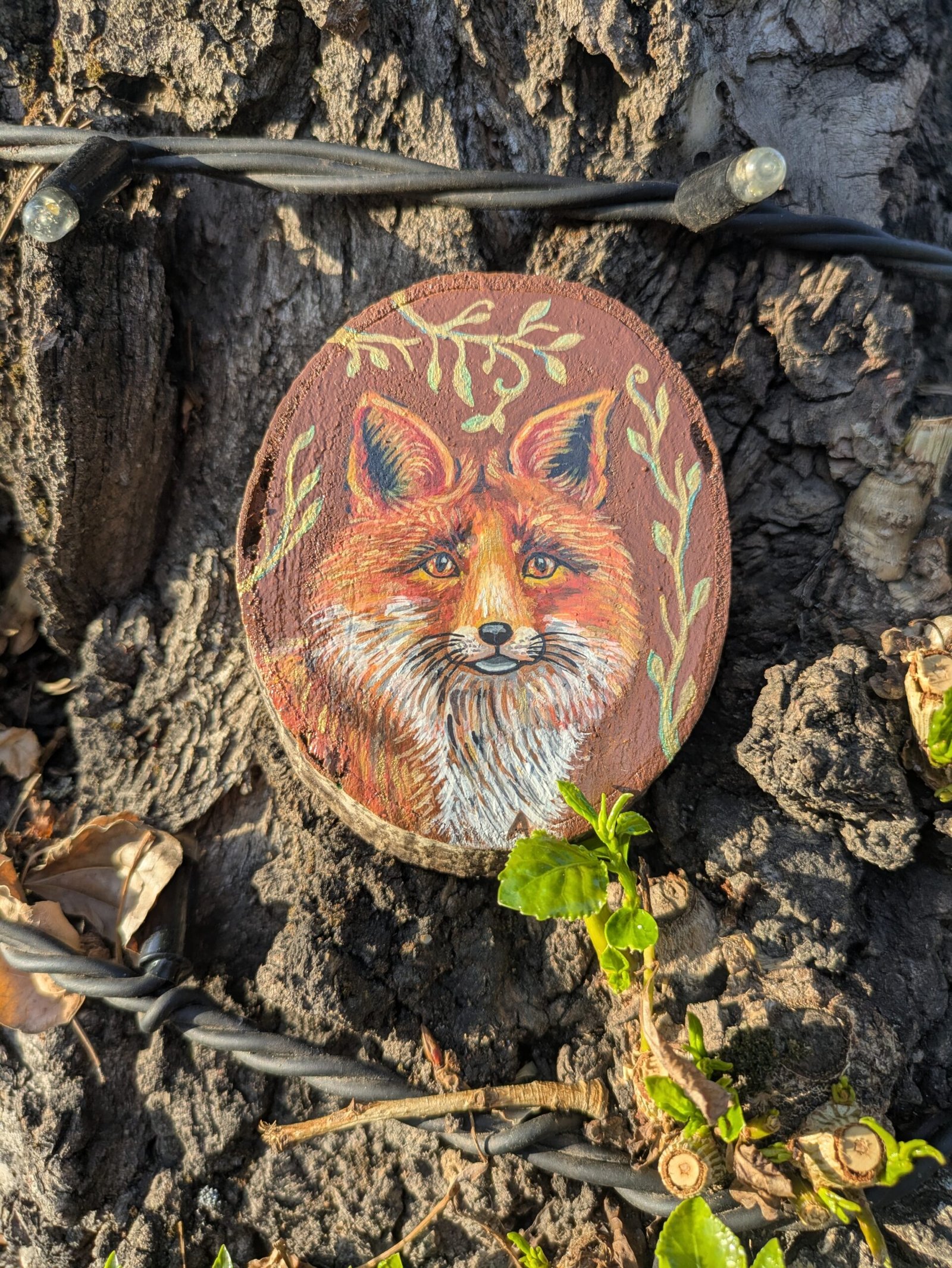 The painting is done on a wooden slice with acrylic and a protective layer on top.