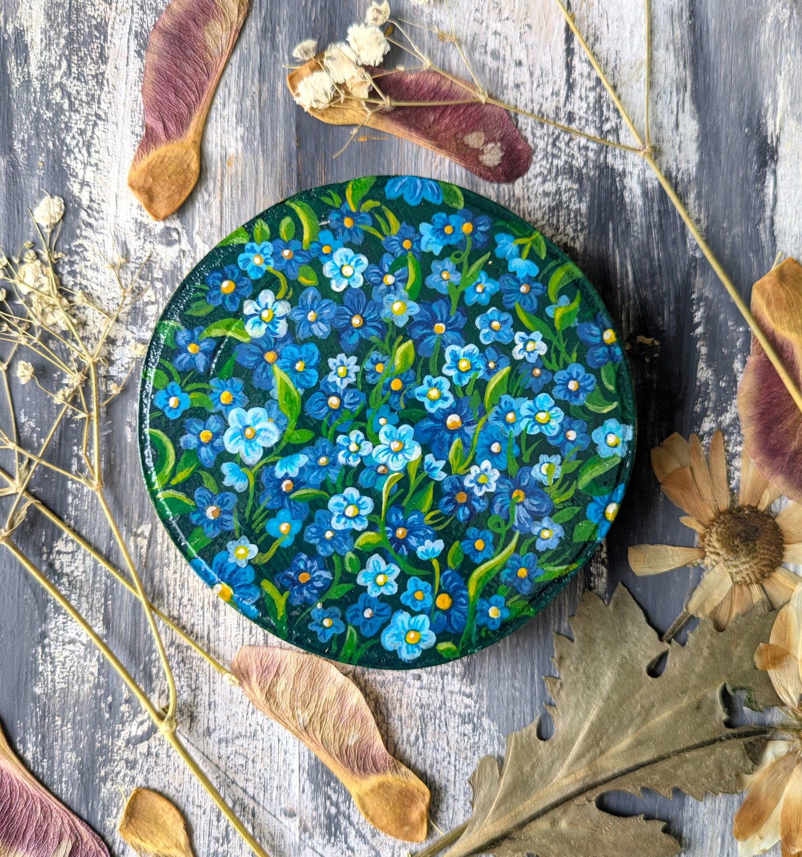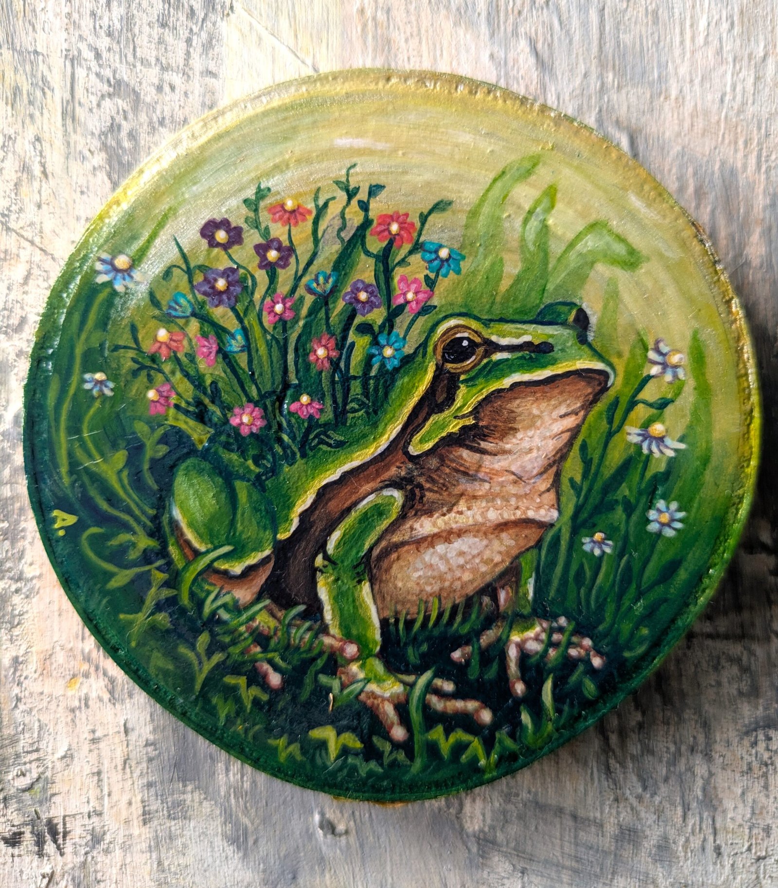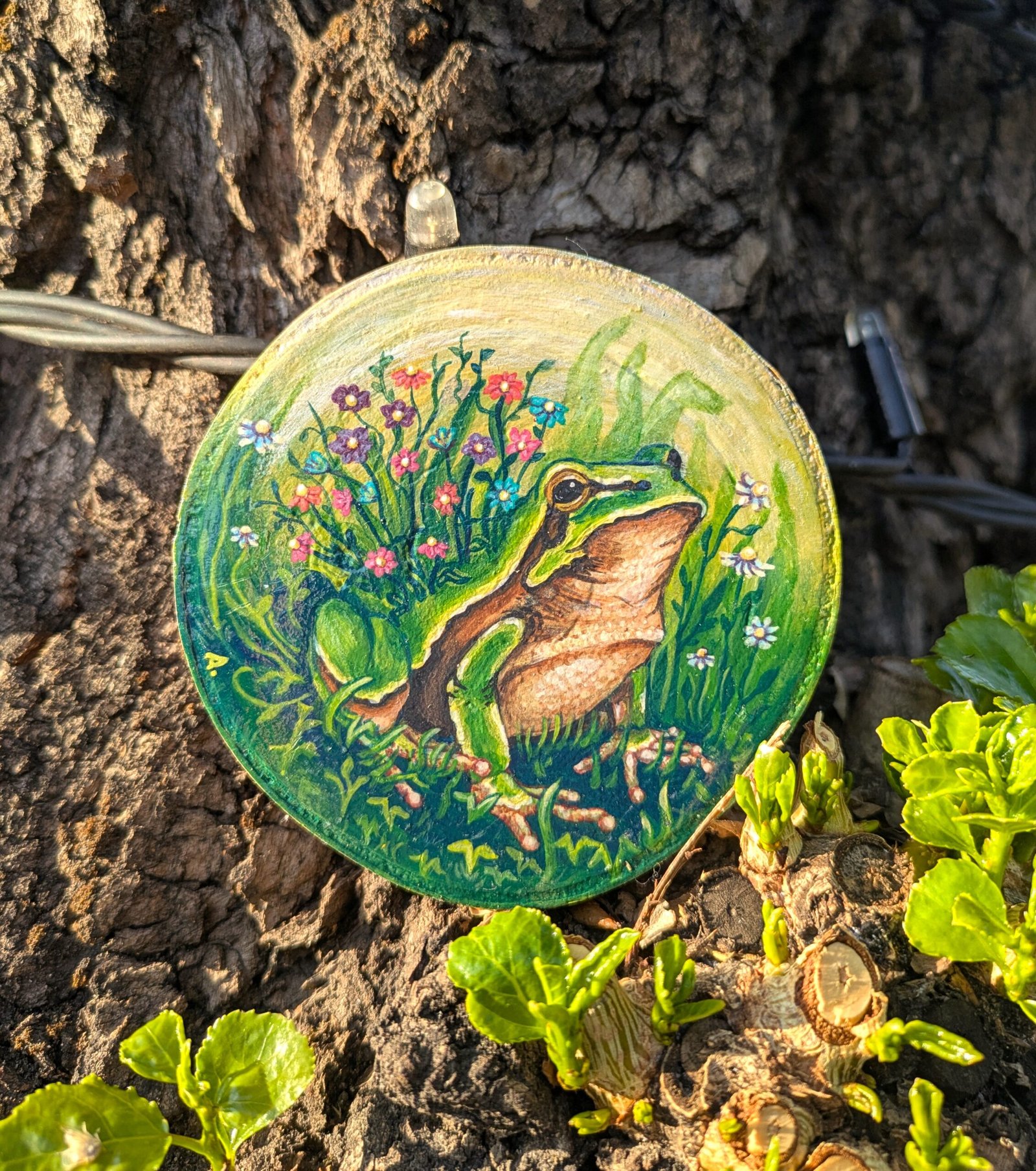 The painting is done on a wooden slice with acrylic and a protective layer on top, painted on both sides. For any person who is a frog, toad and flower enthusiasts at the same time, and can switch this decoration as your mood or environment dictates.