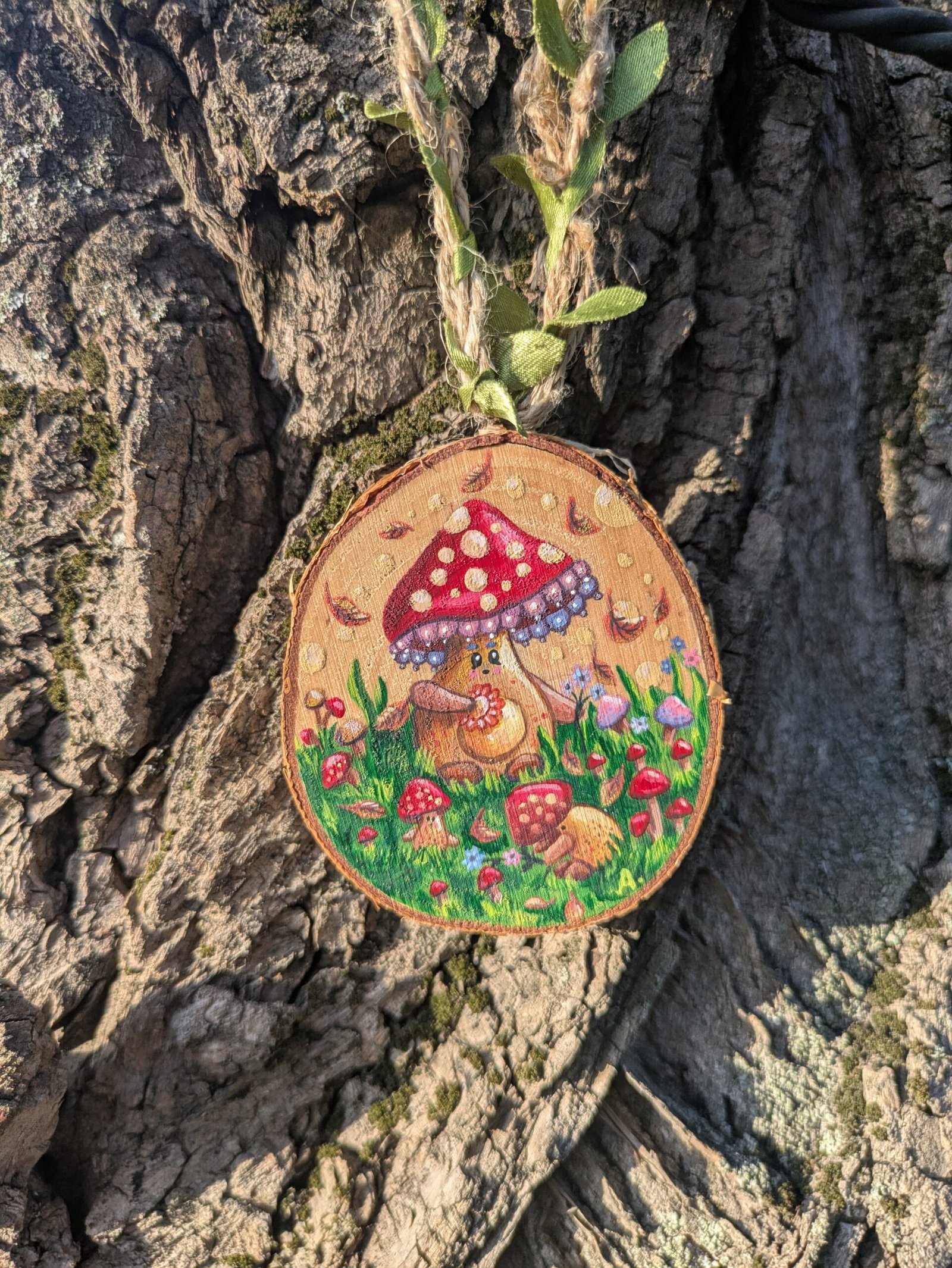 Hand-painted wooden panels with acrylics and a protective layer on top. The dimensions of all these panels are different, hence they are wood slices, but generally its an “oval” shape with the dimensions 6cm. on 7cm.